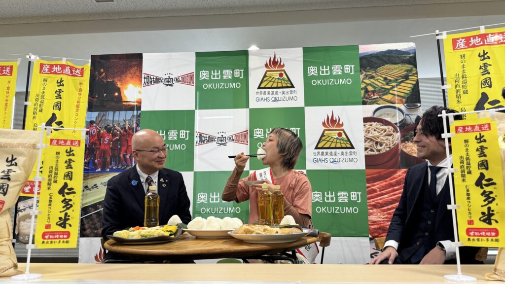 実際に奥出雲へ訪問し「奥出雲 仁多米食堂」でご飯を美味しく、きれいに食べる動画も発信。