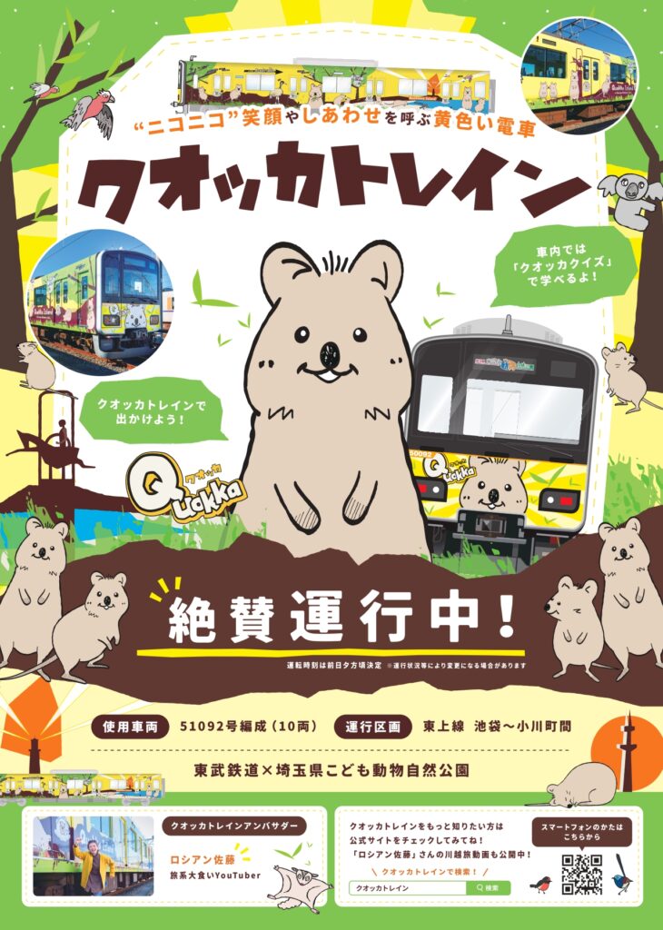 この度、本プロジェクトの一環として、東武鉄道株式会社が推進する「クオッカトレイン」のアンバサダーにロシアン佐藤が就任し、広報用のWebサイト制作、駅構内や園内に設置されるチラシ制作も合わせて担当いたしました。