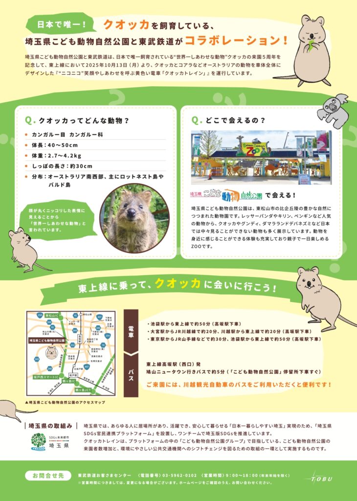 クオッカトレインの運行情報やクオッカの紹介に加え、公共交通機関を利用して訪れることができる東松山市内の観光スポットを網羅的に掲載しました。